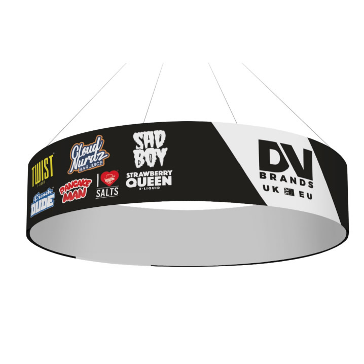 The Fabric Hanging Banner is a must have if you want to get noticed. These extra large hanging banners are produced from high quality fabric and enables your booth to be seen from practically anywhere at your trade show. Available in round, square, and triangle configurations as well as numerous sizes, there is a Hanging Banner that would suit almost any situation. Includes soft carry bag.